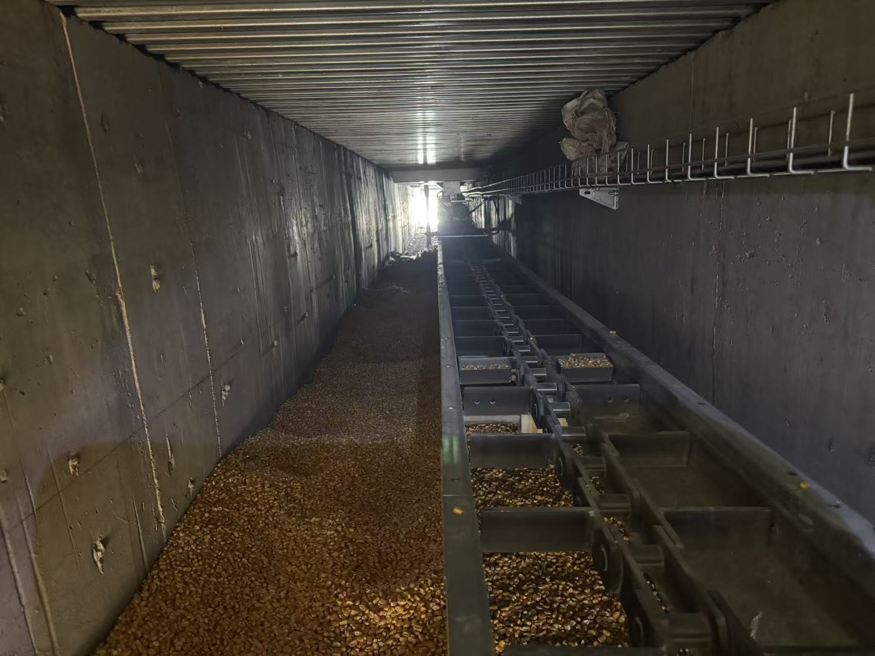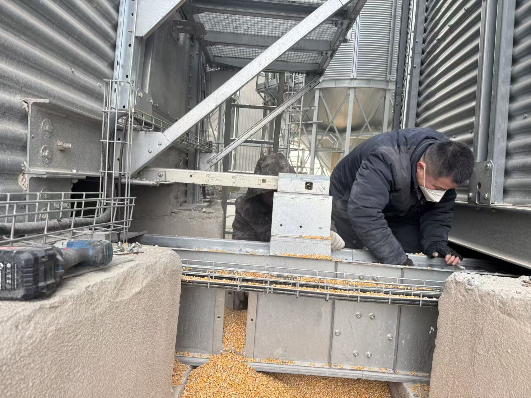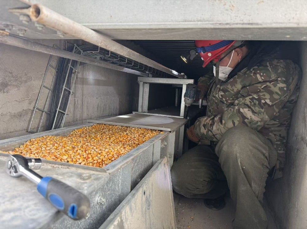 突擊隊(duì)抵達(dá)客戶現(xiàn)場(chǎng)后,立即行動(dòng),有序分工,迅速排查故障,爭(zhēng)分奪秒開展維修作業(yè),但是現(xiàn)場(chǎng)的故障狀況要比預(yù)想的復(fù)雜,由于糧食塞滿了100米長(zhǎng)的刮板機(jī),導(dǎo)致刮板機(jī)啟動(dòng)困難、主軸偏移。為保護(hù)客戶利益,突擊隊(duì)在沒有專用清糧工具的情況下,現(xiàn)場(chǎng)啟用人工清理的方案。